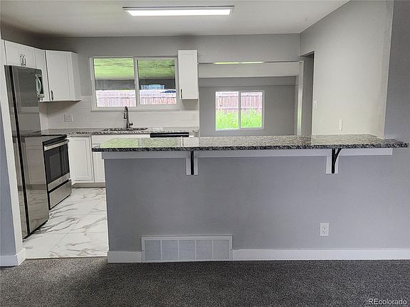 This lovely completely updated home is one of the bigger ranches in Montbello, featuring 4 bedrooms along with 2 non-conforming bedrooms and 3 custom finished bathrooms. Two of the bathrooms are on the main level while one 3/4 bathroom is featured in the basement. The entire home is nicely finished with brand new carpet and custom tile. Enjoy cooking and entertaining in the brand new kitchen - featuring custom shaker cabinetry, beautifully selected granite for the counter tops and brand new stainless steel appliances. There is plenty of room at the kitchen counter to enjoy a quick snack or breakfast. The living room is quite spacious which allows for creative furniture placement. A large sliding glass door leads to the yard and lets a lot of light into the home.