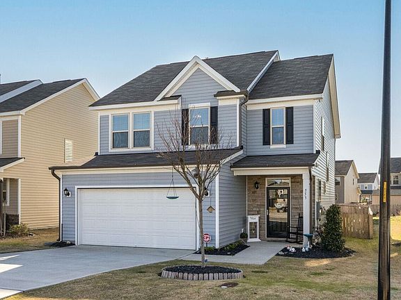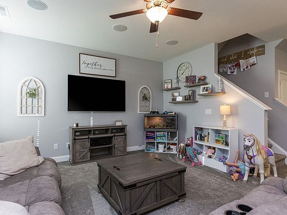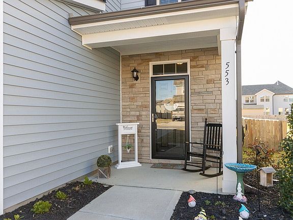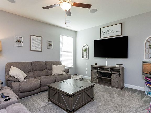 Practically new transitional home with a bright & open floorplan in convenient & popular neighborhood! Covered front entry. Spacious living room w/carpet & ceiling fan is open to dining area and stunning kitchen with luxury vinyl plank floors, granite island breakfast bar and countertops, stainless steel appliances including smooth top range, microwave and refrigerator. Primary suite with double door entry, carpet, ceiling fan, walk-in closet and private bathroom with large walk-in shower and dual vanity. Bonus room/office. Laundry room with washer, dryer & shelving. 2 car garage. Screened porch overlooking fenced back yard with play equipment.
