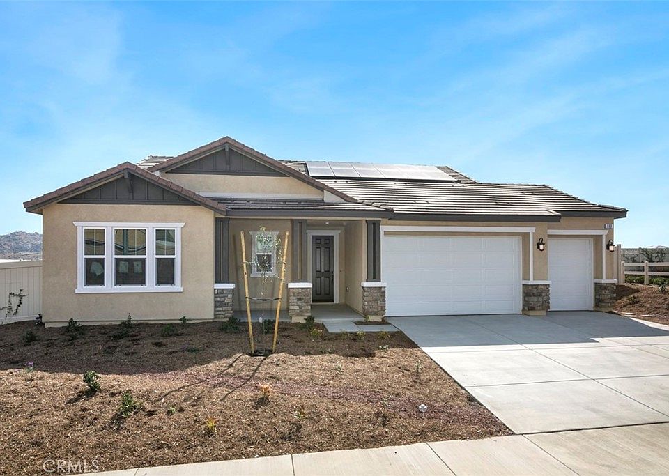 Currently under construction, open floorplan offering 4 bedrooms, 2 baths, large great room with kitchen island, upgraded flooring, 3rd car garage, 9ft ceilings, Tankless water heater and solar lease. Photo is a rendering of the model. Buyer can either lease or purchase the Solar.
