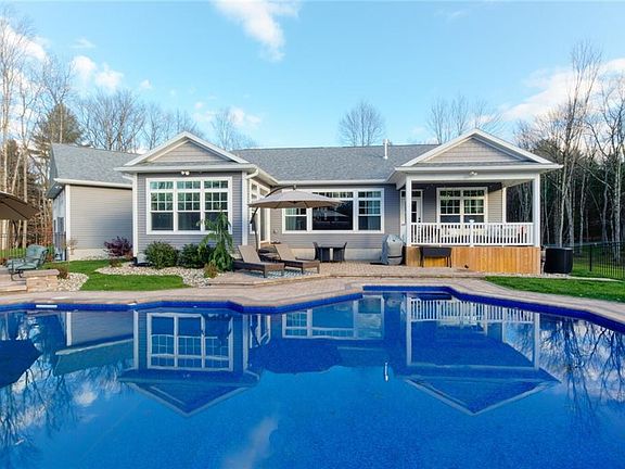 Newer custom built ranch nestled on 10 acres w/ trails & privacy. Ample w/ features & amenities. "Smart home" -control the entire home, in & out (lighting, cameras, audio & temp). Wide plank hardwds/In-floor radiant heat. Kitchen/ dining area w/ soft close cabinetry, granite, stainless appl. including gas cooktop & double ovens, pot-filler,island that seats 6 & walk-in pantry cw/ Ca.closets. Ample living rm space w/ wall of windows, transoms, & floor to ceiling stone gas fireplace, $ coffered backlit tray ceiling. 3 bedrms up, office a 1/2 bathroom & laundry area. Private owners suite w/ vaulted ceilings & private back deck. Custom tile walk- in shower, soaking tub, his and her sink/ vanity & a walk in closet. 2 sizable bedrooms w/full baths. Lit stairs into full, finished basement, w/ 4th bedroom, full bath, even a doggy wash, entertainment are (already plumbed, possible for an IN-law) workout area, theater & gaming/ Family area. Need to quarantine? Luxury patio complete w/ surround sound, in-ground salt water heated pool. This cozy, comfortable yet salacious home has spared no expense! Built to the highest standards, incredible low utility bills & energy saving costs.