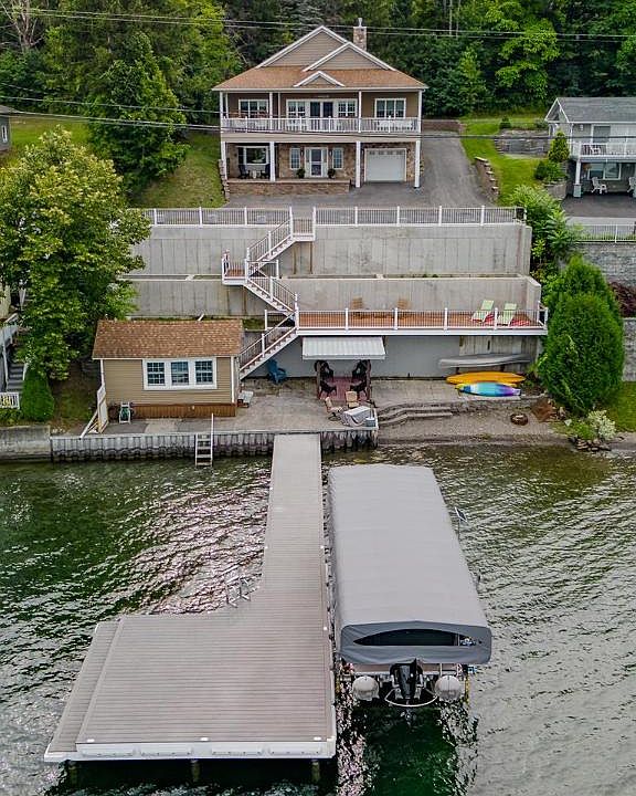 Exquisite Keuka lakefront property on both sides of the road, Ranch with walkout lower level built 2009 with open concept, 5 beds, 3 baths, public water/sewer, expandable attic for play/entertainment room & balcony. Maintenance-free decking & retaining wall, mostly furnished, bunk house, solar/remotely operated 5000lb lift. Breathtaking lake view, easy swimming, large dock & boat space. Bunkhouse with half bath & fridge. Rented slightly to friends and family. Ideal oasis which can pay for itself. Turn key, comes mostly furnished.