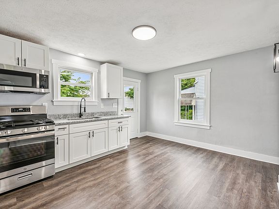 *Eat-in kitchen featuring new cabinets and counters; equipped with stove and refrigerator.