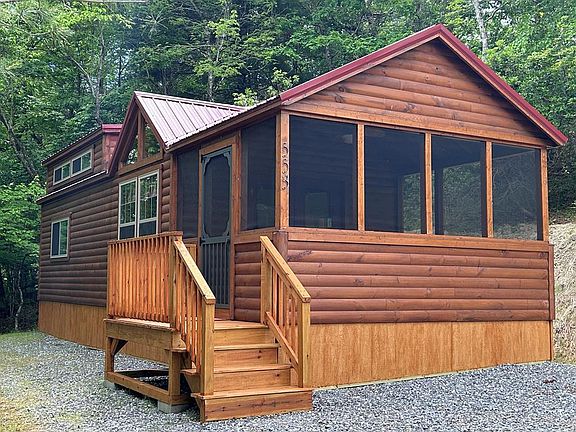 Rustic Park Model cabin with red cedar log siding, large screened in porch and custom handmade hickory cabinets. With almost 400 sq. ft. you will find incredible versatility in the open floor plan that includes a living room, kitchen and dining room area, bedroom, full bath, space for a stackable washer & dryer and a loft. All furniture is included in the sale. This spectacular tiny home is in Tiny Mountain Estates, which is only 15 minutes from downtown Franklin NC. The development is designed for both full-time residents and vacation rentals and located in a gorgeous area of Macon County with short- and long-range views of the valley. All roads in development will be paved completely once construction is complete.
