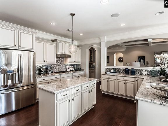- RoomKitchenFeatures: Granite Counters, Kitchen Island, Pantry, Recessed Lighting, Ceiling Fan(s), Fireplace, Eat-in Kitchen, Floors-Hardwood, Bar, Backsplash-Tiled