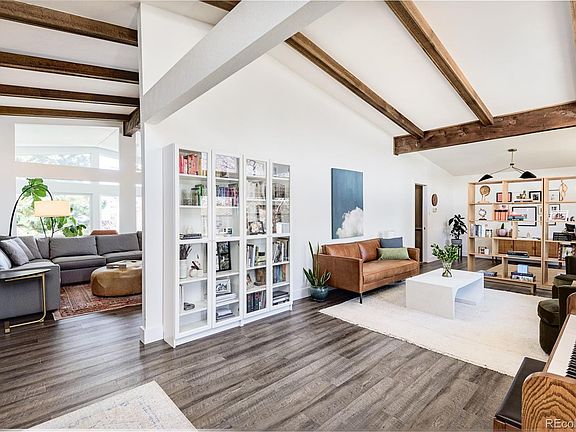 Perched on a quiet cul-de-sac only blocks from the trailhead up Green Mountain, this gorgeous Midcentury modern home has it all. With over 4000 square feet of living space, 5 bedrooms, 3 baths and incredible remodeling throughout, the house is a gem. You'll enjoy the vaulted ceilings and beams, open floor plan, walkout basement, custom landscaping with new fence, incredible views/privacy and spacious rooms throughout. The main floor alone features 3 separate living spaces each flooded with natural light providing ample space to gather and connect, including a balcony right off the kitchen perfect for taking in the surrounding natural beauty. The main floor primary bedroom and ensuite has a magazine-worthy remodeled 5 piece bathroom with heated floors that's only made better by mountain views. A large secondary bedroom and bathroom are also on the main level. The walkout basement is filled with natural light and offers a truly stunning wet bar including beverage fridge and 2nd dishwasher, cozy living room with fireplace and sliders that open out to an incredible covered patio where you can enjoy the built-in fire pit with gas connection and spacious backyard. Also on this level are three conforming bedrooms, a beautifully remodeled bathroom and fantastic storage spaces. The home comes with solar panels (the system is owned, not leased) and the owners have enjoyed the energy savings. All of this on a quiet cul-de-sac surrounded by some of the most beautiful trails and landscapes in the metro area.