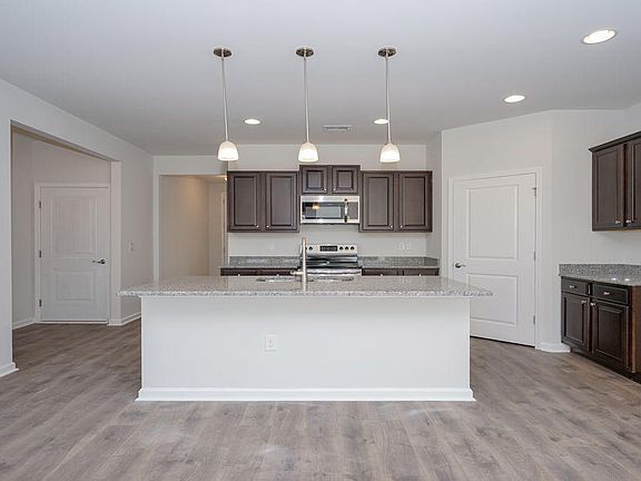 Downsize without feeling the pinch! This well laid out plan offers 1,558 heated sq. ft. of living space but lives much larger. It has, 3 BR, 2 Bath, front covered porch and a 15'8'' X 22'' extended rear covered porch off dining area. Great outdoor living space for sitting and grilling out. Luxury Wood laminate flooring throughout main living areas, ceramic in laundry & baths. Kitchen features granite counter tops, walk in pantry, pendants over a large counter height island that overlooks the dining area and living room which is perfect for entertaining. Spacious master suite & bath with large Walk in closet, double vanity with drawers & sinks, 5' walk-in seated shower.