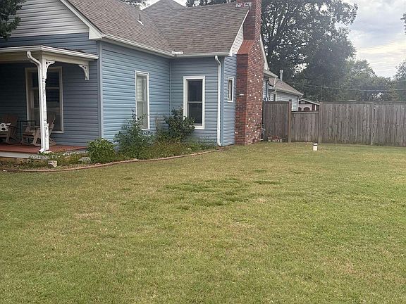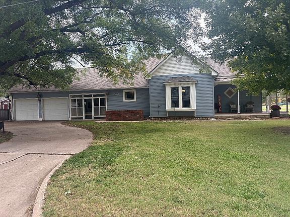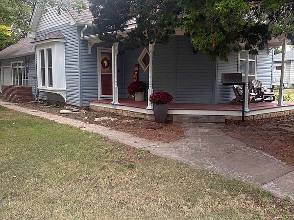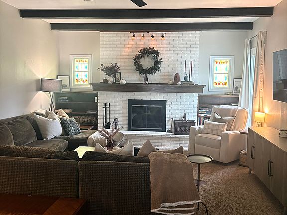 Tucked beneath mature shade trees, this charming 2~bedroom, 1.5 bath home is full of character and updates you will love. The spacious living room features a cozy fireplace with beautiful wooden mantal, matching wooden ceiling beams, and stained~glass windows for timeless appeal. Breezeway attaches double car garage for easy access. Sit on the wrap around front porch or enjoy a large, private backyard with storage shed and privacy fence~perfect for outdoor living. With a newer roof, siding and vinyl windows this home blends comfort, style, and peace of mind..