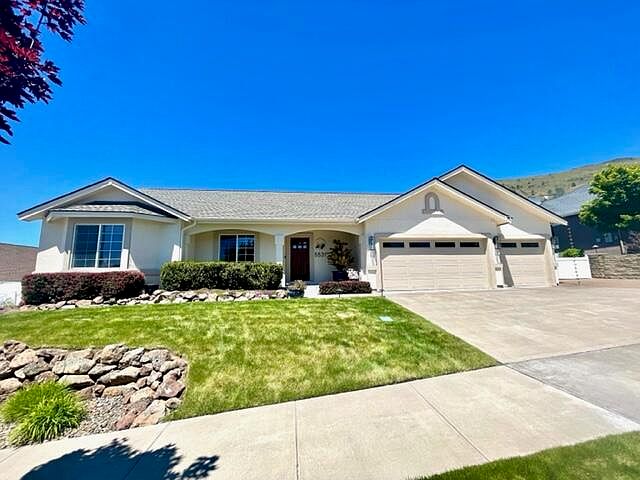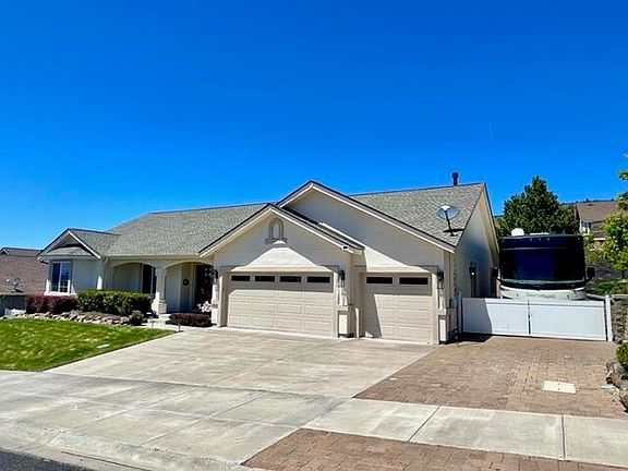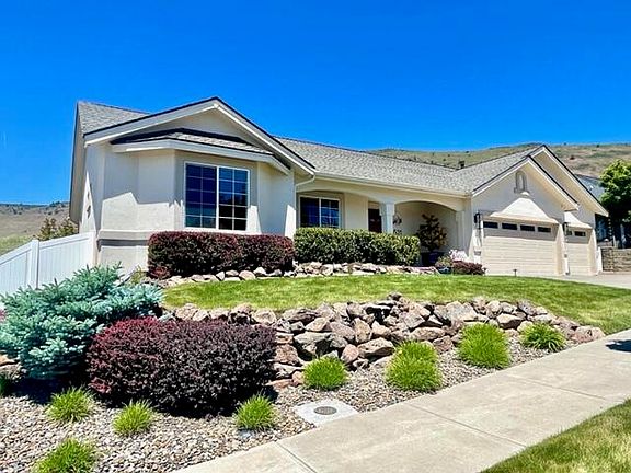 Beautiful home in North Hills that feels like NEW! Featuring an open floor plan, beautiful hardwood floors with carpet in the living room. Refaced gas fireplace with surround sound speakers, & windows that look out to the back yard. The kitchen features custom cabinetry, tile back splash, newer stainless appliances, solid surface counters & wrap around bar seating. Huge primary suite separate from the other 2 bedrooms, with great walk-in closet, double sink vanity, jetted tub, & oversized shower. Large laundry room off the attached 3 car garage with 38' RV parking on the side. Relax year round on the covered back patio while you enjoy views of the landscaped, terraced back yard & hogs back mountain. Great storage/garden shed with windows & power. This home is in perfect condition and turn-key! Don't miss the opportunity to make it your own!