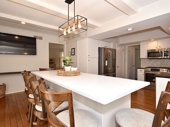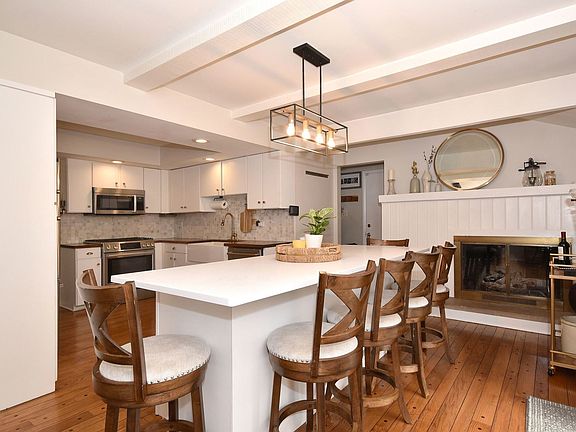 One level living at its finest! Darling 3 bed, 2 bath ranch home in Ridgewood situated on a corner lot with circular driveway and attached 2 car garage! Off the gracious foyer you'll find the refreshed kitchen with pantry, farmhouse sink, new Bosch appliances, and walnut butcher block counter. Extended kitchen area offers a large island with ample seating, quartz countertops and a cozy fireplace with access to the yard from sliding glass doors-truly designed for everyday living and entertaining! Living and dining rooms are bright, airy and spacious with pretty views of the generously sized fenced yard complete with patio! Great sized bedrooms and primary bedroom has its own remodeled bathroom! Hardwoods and updated lighting throughout! Plenty of storage in the crawl space! Here's your chance to own in an area with highly rated schools, wonderful parks and convenient location close to train, shopping and restaurants!