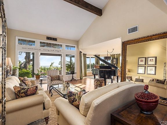 This was the model home for Crest de Ville when it was built! Why? Because it perches up at a point with unobstructed views towards the Pacific Ocean, Palos Verdes, the Orange Hills, Catalina Island, Long Beach and San Clemente Island. Extraordinary fireworks and twinkling of city lights are a great entertainment. Very private large lot with grassy area, fountain, patio, pool and large front courtyard. This remodeled home has a large elegant first floor master bedroom suite with luxurious bath that includes soaking tub, skylights, granite counters, separate stone shower, stone floors, walk in closet and high ceilings with french doors leading to backyard and views from the bedroom! Upstairs has two more bedrooms and 2 baths with one en suite with a fireplace. Beautifully remodeled kitchen with custom cabinets, island, stainless steel appliances, granite counters, built-in buffet and separate butler's pantry. Charming home that flows easily from the entertaining courtyard area, to the large living room with 2 story ceilings and into the dining room, kitchen that opens into the family room, side yard and back...all while enjoying the aviance and the views. A separate man cave is also a great get away where you can enjoy your own kegerator with wet bar. Additional amenities include engineered wood floors, crown molding, recessed lights, sky lights, paid solar panels and high ceilings. View the virtual tour as well!