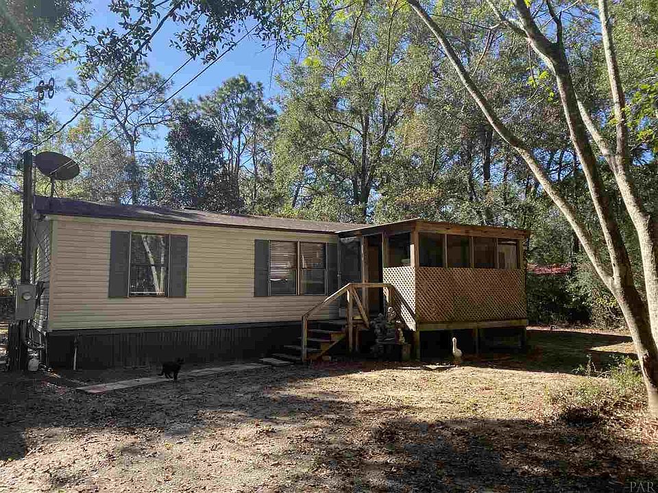 Double Wide Mobile Home on approx. 1 private acre in Pace High School Zone. Great location convenient to I-10 and shopping. Split floor plan. Spacious living area. Not a major fixer upper but home does need some work. New AC last month. New stove in April. Fridge, washer and dryer convey. Cash only due to tongue/hitch is still attached.
