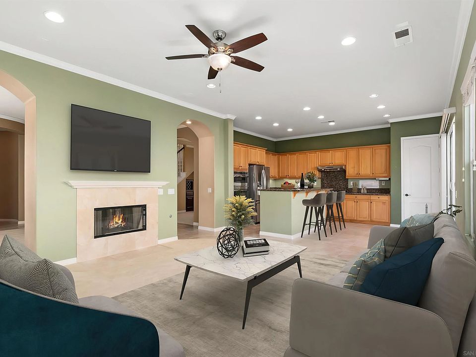 Welcome to your new home in highly sought after Pacific Highlands Ranch. Located in a quiet, family friendly neighborhood, within walking distance to award-winning schools—Sycamore Ridge Elementary, Pacific Trails middle school, Canyon Crest Academy high school, and Cathedral Catholic High school—this five bedroom three bath home with excellent floor plan is sure to impress. The master suite features an extensive closet with custom built-ins, dual sinks, and a Roman-style tub. Outside, a beautifully landscaped and secluded private backyard awaits. This energy efficient home is heated and cooled with a heat pump system. Seller-owned solar allows the potential buyer to have low utility bills. Enjoy access to the private, newly remodeled West Highlands Pacific recreation center with its Olympic sized swimming pool, spa, fitness room, clubhouse, barbecue, and children’s water play area, all included in the low Homeowner’s association fee and low Mello Roos. Start planning your move today!