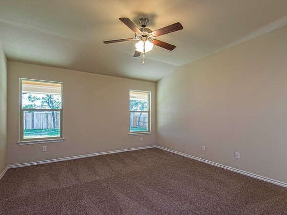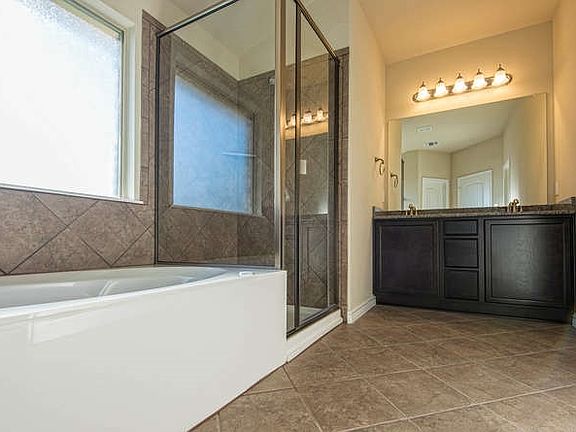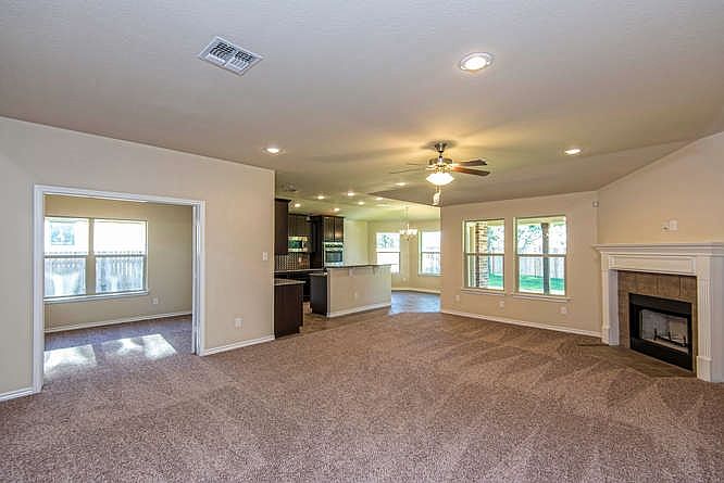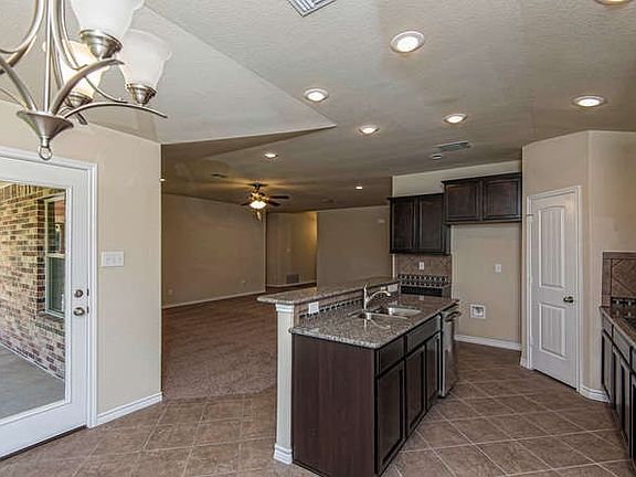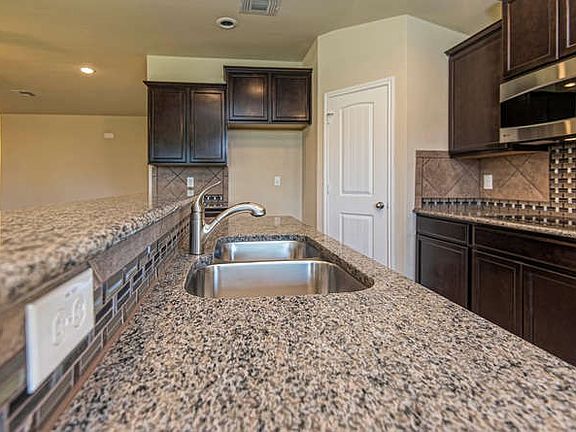 New Home w/Striking Brick & Stone Exterior has an invitingly open floor plan! Gourmet Kitchen w/ Center Island, Built-in Dbl Oven & Granite opens to the spacious Living Room. Recessed & Pendant Lighting adds elegant touch. Unwind on 35' covered patio & enjoy mature trees! Master suite has great walk-in closet, Whirlpool Garden Tub, Sep. Shower, Granite & Dual Vanity. Versatile floor plan with study or formal living room. 3rd car garage for extra storage. Homesite is fully landscaped w/ sprinkler system.