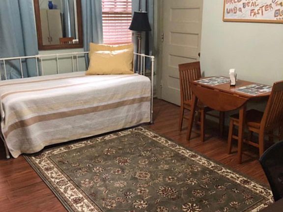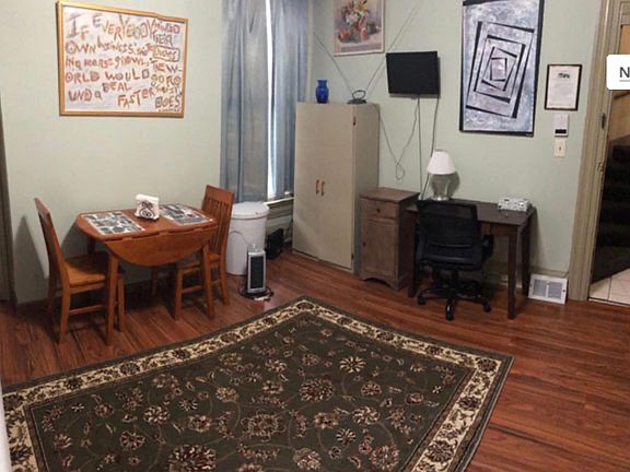 Renovated: Paint, new hardwood floors, furniture, kitchen. This is a lovely, little studio. Small, first floor studio with twin daybed. Room size: 13' x 14'. Monthly: $1,300. Single person occupancy. Weekly cleaning by our staff included. Our unique apartments are sparkling clean. Completely furnished with everything you need - towels, linens, and a fully equipped kitchen (including small appliances). All utilities, c/a, gas heat, high-speed COMCAST XFINITY Internet included. Monthly rental. Stay as long as you'd like. No lease.