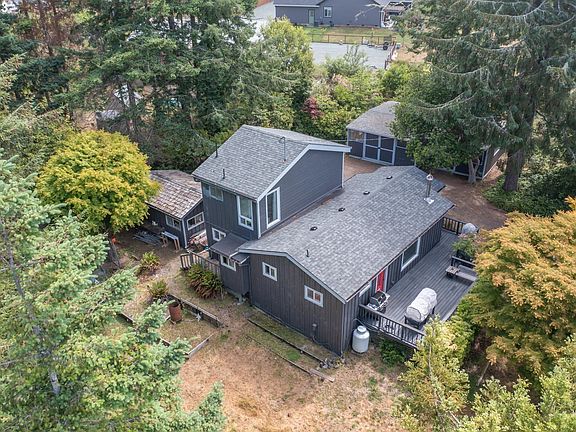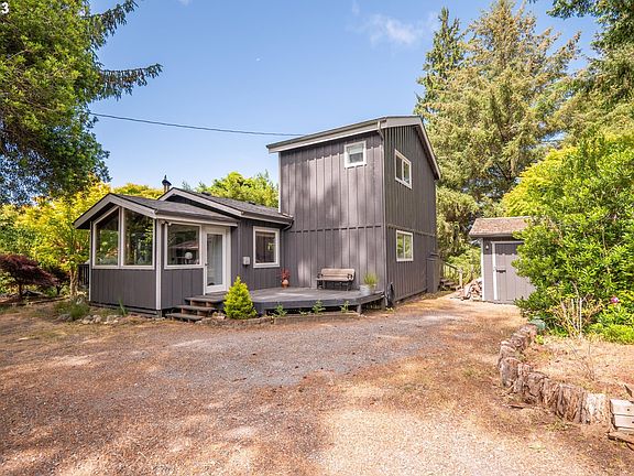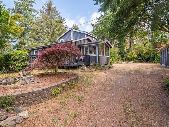 ABSOLUTELY ADORABLE COUNTRY COTTAGE, just thoroughly renovated on a peaceful & private 1.14 wooded acre, located at the end of a quiet, private lane on Bandon's warmer side yet close to town & minutes to beaches & golf! SOLD MOSTLY FURNISHED home features 2 Master bedrooms each with their own en suite full baths, an additional full bath, Great Room with certified Lopi Wood Stove, Gas Range, Butcher Block kitchen counters, small Sun Room/Library, wood beamed vaulted ceilings, many large windows to take in the enchanting grounds with amazing trees, large southern deck, newer roof, detached garage/shop, 2nd mini shop, chicken coop. Truly an exceptional hideaway!