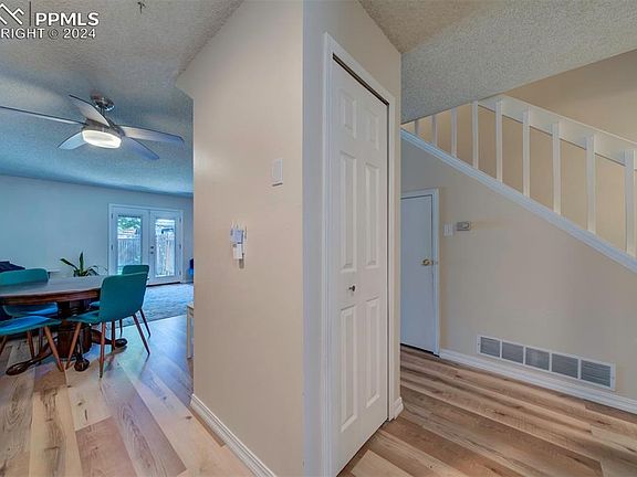Entering this beautiful townhome, you will immediately notice it is loaded with upgrades! The remodeled kitchen includes NEW quartz countertops, cabinets, hand painted ceramic tile backsplash, window, touchless kitchen faucet, newer appliances and opens to the dining area. Enter the Living room with fresh paint, a wood burning fireplace, NEW ceiling fan and NEW french door that lets in lots of natural light. Main level also features a half bath with NEW quartz counter vanity and NEW energy efficient toilet. Stay nice and cool with your air-conditioning or enjoy the outdoors with your NEW patio, cozy fenced in yard and NEW storage shed! The upper level has two spacious bedrooms with newer upgraded carpet. The large bathroom has NEW double vanity, quartz counters and energy efficient toilet. So many upgrades...NEW water heater, HVAC has been sealed, luxury vinyl plank flooring throughout the first floor and bathrooms, all doors and light fixtures switched to LED and all new outlets on main. Home borders to parking area. Home is centrally located so there is easy access to Powers corridor, shopping, entertainment, Peterson AFB you name it. HOA is in process of the main water line approval for repair. This effects the lawn and lawn maintenance. Thank you for showing! Great home at a great price!!