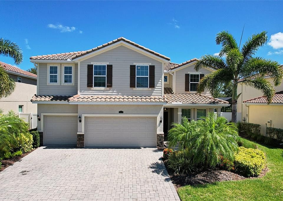 A beautiful house of 4 bedroom, 4 bath, and 3-Car garage locates in the private and maintenance-free community of Ashton Pointe. The house with total AC area 3259 sqft features spacious family room, dining room, nook and kitchen with an expansive island. A Den and full bath on the 1st level can easily become the 5th bedroom. Upstairs are 4 Bedrooms, 3 Full Baths, Laundry room, and a large bonus Room. It has a front porch, a covered Lanai in the back, paved driveway and walkway, radiant roof barrier, double-paned windows/doors, hurricane shutters. Backyard has plenty room for a swimming pool. The first floor offers tile through-out living area, roof with recessed lights, and kitchen with upgraded cabinets, and stainless steel appliances. Granite counters, tiled backsplash, tiled tub & shower are in kitchen & baths. The second floor has new carpet installed. New whirlpool washing and dryer, and new water heater were also recently replaced. The house interior and exterior were newly painted. The community offers maintenance-free living including lawn, plant care, irrigation system, playground. It is conveniently located a few blocks from “A” rated schools Ashton Elementary & Sarasota Middle, ½ mile west of I-75 and nearby to shopping centers, state park, restaurants , and minutes from world famous Siesta Key Beach.