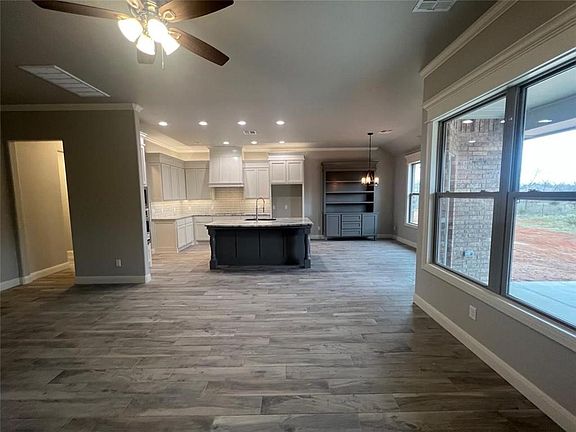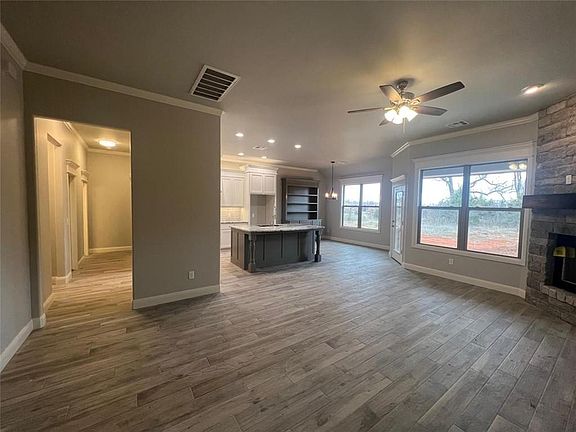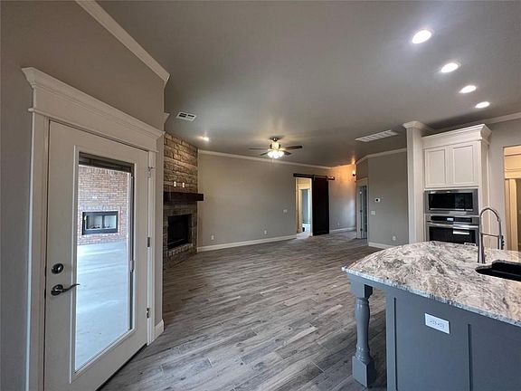 Welcome to Charter Oak Hills newest addition. All the amenities Skyline Construction is known for! Wonderful wood look tile throughout. Crown molding and 4 inch baseboards with window framing and door molding in common areas! Wood burning, floor to ceiling fireplace is the focus of the living room with a stained block mantel that matches the barn door dividing the secondary bedrooms. Kitchen includes built in stainless appliances with a breakfast island separating the kitchen and living. Primary bedroom has a wonderfully appointed master bath that includes a floating vanity that has