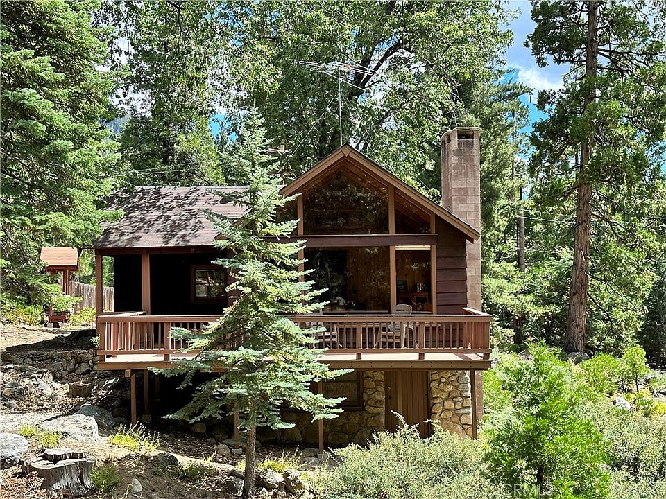 Welcome to the Fern Valley community in Idyllwild. Nestled in the heart of the San Jacinto Mountains, this cabin sits on a pie-shaped lot that is a little over half of an acre with unblocked views of "Suicide Rock". If you are looking for a private mountain retreat, this is it. Breathe in the fresh air as you walk up from the driveway to the expansive front porch. This porch has been rebuilt using Trex composite decking, making it durable for years to come. This home is a classic A-Frame-style cabin. As you enter the living area, you're welcomed by the high beam ceiling, pinewood siding, and incredible views from the front floor-to-ceiling windows. The dining room, on the back side of the home, looks out toward the forested property between the main home and the guest house. The kitchen has been updated with granite counters and a double stainless steel sink. The cabinetry is still the original pine cabinets. The large rock fireplace is wood-burning and can keep the room warm, but even better is the Canadian-built wood-burning stove. Get ready to hunker down for some romantic winter evenings. There is a full bathroom in the main house as well as plenty of closet and storage space. The loft provides room for two twin beds, and climbing a ladder to get to the space is great fun for kids. The back patio is also made of Trex composite decking and has a large oak tree for shade. Between the main house and the guest house is an outdoor sink, a great place to have family picnics or BBQ's. The guest house is a single room with a 1/2 bath. There is an additional room that could become a kitchen if you add a sink. The location of this cabin is ideal. You're situated between the idyllic town of Idyllwild with local eateries and galleries, and the San Jacinto wilderness area with hiking trailheads nearby.