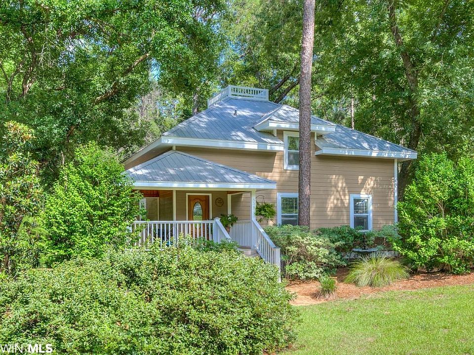 Picturesque 2215 sf, 1.5 story Captain's cottage complete with Widow's Walk nestled on large 0.63-acre lot adjoining a wooded common area for additional privacy. While surrounded by mature landscaping with dual concrete driveways, there is under-dwelling parking spaces plus additional parking areas. A spectacular 3 bedroom, 2 bath custom built one-owner gem with so many quality upgrades just a few blocks from public bay access and the sought-after convenience to Fairhope Municipal Pier/Park, Fairhope Yacht Club, Fairhope West Elementary, and quick access to parades and all that downtown has to offer. Custom features include a grand 39' x 15' primary suite complete with 14' ceiling, sitting area, tongue and groove shiplap bathroom with cypress window seat and cypress vanity countertop, in addition to huge 13' x 9' walk-in closet; spacious 26' x 21' living room with soaring 23' vaulted ceiling crowned with exposed cypress beams, along with a large custom built-in cypress/cedar bar; 19' x 13' eat-in kitchen with solid cabinetry, custom cypress countertop, smooth top range, French door refrigerator, and pantry; Cypress countertops throughout; dual A/C units for added comfort plus insulated windows and doors. For outdoor enjoyment, there are 2 porches with finished pine tongue and groove ceilings, including a screened porch with dual ceiling fans. It's obvious this home has been lovingly cared for inside and out!