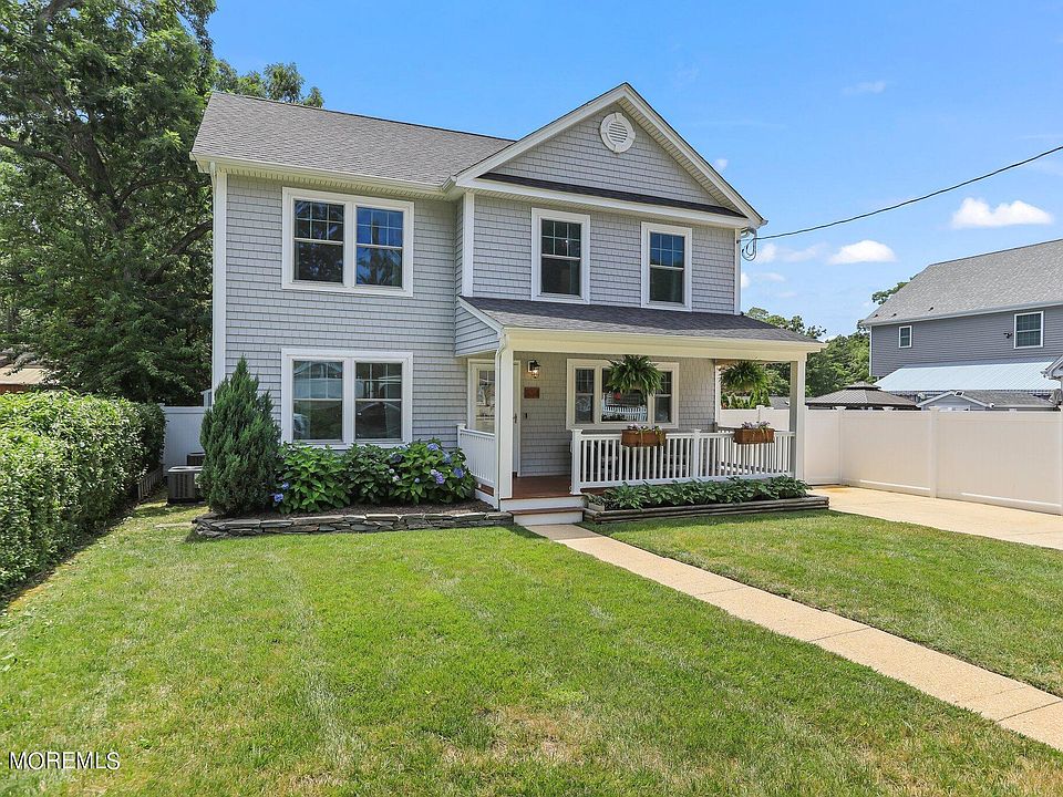 You will love this beautiful Colonial in the highly sought after Shark River Hills! The rocking chair front porch for your morning coffee welcomes you to this 4 Bedroom 2 Bath home which has been renovated in 2020-2021. The stunning kitchen features stainless steel appliances, dual color island w/ quartz countertops, and a microwave drawer. The 1st floor features a living room w/ gas fireplace, crown molding, custom built-in shelving, and an option for ONE LEVEL living w/ first floor bedroom & full bath. The primary bedroom has an impressive, vaulted ceiling and large walk-in closet. Other features include hardwood flooring, 2nd floor laundry, smart home Nest thermostats, security system, recessed lighting w/ multiple dimmer switches, gas line for grill, large garden shed, fully fenced in yard, newer mechanicals and more! Shark River Hills is an amazing area w/ the scenic waterfront and convenience to all of the shore's hot spots including beaches, dining/shopping, Asbury park and more. Take action today and secure this incredible home!