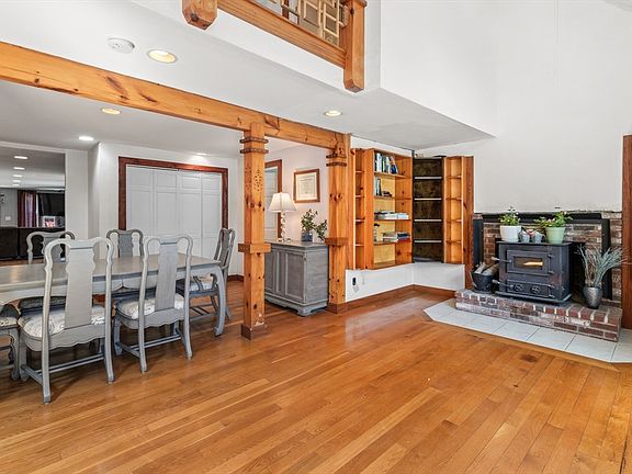 You are going to love this unique and expansive Cape style home. The first level is entirely open from the front door to the sliders in back leading to a wrap around deck. the 1st area you'll enter is currently used as a living room with cathedral ceiling, fireplace with wood burning stove and built-ins. Hardwood floors shine throughout both levels. Radiant heat on 1st floor and finished basement floor. Next inline is the dining area, followed by a kitchen meant for entertaining with its 6 person breakfast bar. Plenty of space for a dining area or a family area with 2 sets of sliders to the wrap around deck. Rich wood staircase leads to a 240 sq ft landing with a full bath and office nook. The owners' bedroom is nearly 600 sq ft and having a walk-in closet and 13' x8' bath with jetted tub and separate shower. bright bedroom with 8 windows, recessed and track lighting! Guest Bedroom above garage is spacious & bright! Big surprise is the finished basement with professional sound studio.
