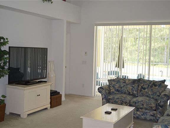 Peace, serenity and quiet beauty surround this southwest facing pool and lovely conservation lot, giving you an outdoor paradise. This beautiful, fully furnished home offers a spacious foyer leading to a kitchen/dining combo and open family room facing the pool and fantastic private view. The kitchen is fully equipped, has Whirlpool appliances and shows a lovely bay window in the dining area. There are unique plant shelves in the living areas and many closets throughout for adequate storage. The master bedroom suite views the pool, with dual closets and plenty of space for a king bed. The master bath has marble countertops with dual sinks, garden tub, large shower, and privacy toilet. A second "suite" offers a pool bath with a tub/shower combo and marble counters which adds convenient access to the partially covered lanai. The other two bedrooms are tastefully decorated, Disney style, with twin beds and share a full bath. The garage has been converted to a game room with a ping pong table, pool table, bicycles, storage & more. The hot water heater, pool heater and dryer are all gas. This home is equipped with an alarm system which adds to the security of the CCTV provided by the HOA. Don't miss this beauty ready to go, loved by its original owners. It would make a wonderful vacation or residential home and even has a property management already in place. A one time Capital Contribution of $2,000 is due at closing payable to the HOA.