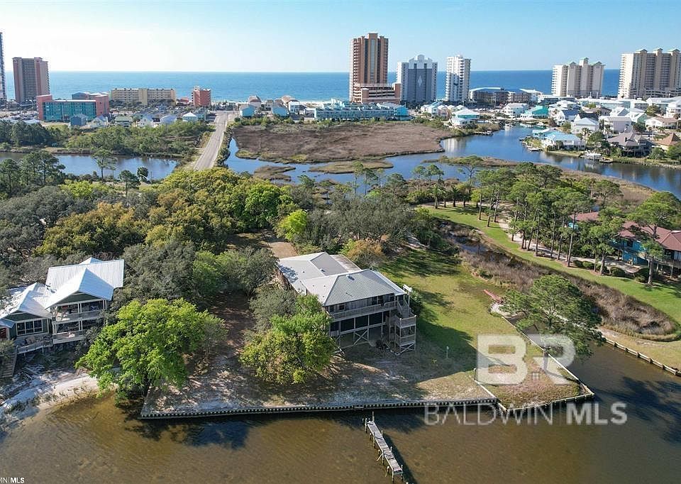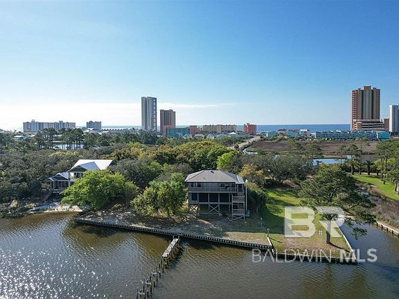 A slice of Paradise on this home overlooking Little Lagoon and just a short walk to beaches of Gulf Shores that is nestled among old growth trees and beautiful flowers. This home was built to entertain with a large great room area kitchen and dining. Large covered deck facing the lagoon and side porches on both the side main and upper level all have great sunrise and sunset views. 2 bedrooms and1.5 bathrooms on main level and the master is up the stairs with its own eat in kitchen, 2 full baths, a sauna, jetted tub, separate heat and air, new water heater and could be used as an apartment. This home has stood the test of time. (Per Seller, updated grade A Cypress exterior walls, metal roof, A1 ponderosa pine tongue and groove walls and ceiling, hard pine floors and yes it runs under the carpet. Over-sized counter top in kitchen with hidden plugs are perfect for entertaining. Pet screening covers the side porches with pull down shades and solid wood shutters are easy to open and close. A solid Aluminum lift with chair is on the west side of the home to get furniture and groceries upstairs. Closets are cedar lined with tons of storage and movable swivel shelving. 3 different stairs to get around the home with great views of Little Lagoon. Parking is easy with 2 garage doors and under home parking that runs the length of the home with a half bath and work area. Local historical wood used in the Master upstairs). Far too many features to list, this home is a must see. Call your favorite agent and come see this hidden piece of paradise located just a short walk to the beach.