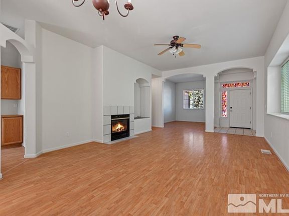 Welcome to this charming single-level home in Northwest Reno. Step inside from the inviting front porch to an open and spacious great room featuring high ceilings and a cozy gas log fireplace—perfect for relaxing or entertaining. The sunny, well-appointed kitchen offers a dining area, center island, stainless steel appliances, and a sliding glass door that opens to the backyard. A versatile bonus space at the front of the home is ideal for a home office, study, or flex room. The primary suite includes a walk-in closet, dual-sink vanity, and private access to the backyard through an additional slider. Two secondary bedrooms are thoughtfully positioned on the opposite side of the home, providing privacy and comfort. Additionally, there is easy access to interstate, shopping and walking trails Don't miss the opportunity to see this wonderful home—call today to schedule your showing.