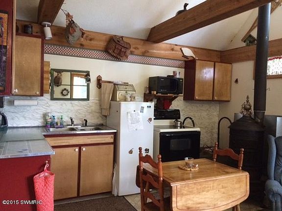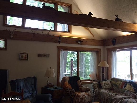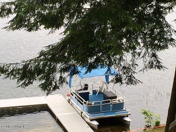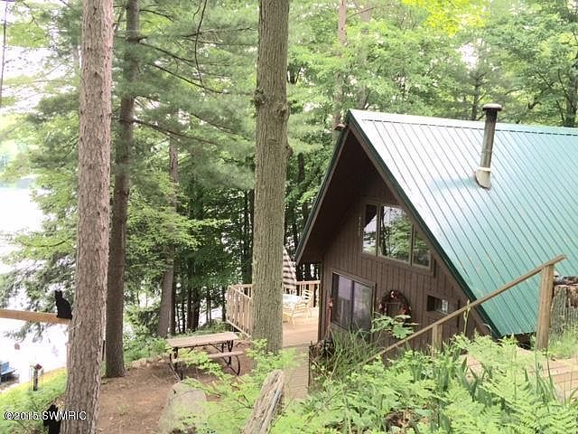 120 FT OF SANDY BOTTOM BLUE LAKE FRONTAGE - This adorable 2 bedroom cottage features an open floorplan with vaulted ceiling, main floor bedroom w/slider leading to the spacious deck, large loft area provides lots of additional sleeping space, 1890 pot belly stove which heats the cottage on those cool evenings and it comes completely furnished including the pontoon boat! Detached garage with loft area - perfect for storage or add'l living space. Blue Lake is a 69 acre lake and is 60 ft deep and known for its great fishing and sandy bottom - great for swimming. They also have deeded access to the nicely wooded 250+ acres of association property. Whether you like to swim, kayak, fish or hunt, this cottage has it all!! Call today!