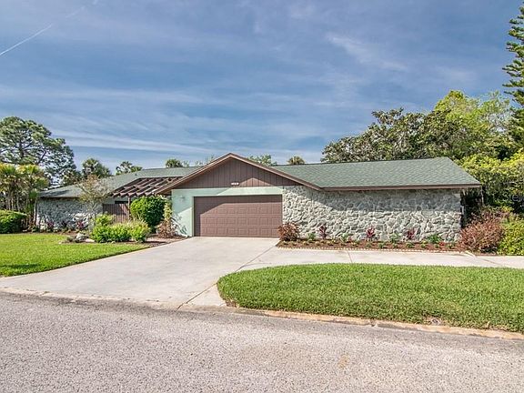 GULF HARBOR WOODLANDS SPACIOUS HOME ON EXTRA LARGE LOT and BIRDCAGED POOL..4 bedroom, 3 bath, 4 car garage on almost a 1/2 acre...From the moment you drive up you will fall in love with the corner lot with lush landscaping...foyer entry...sunken living room and dining room combo, family room, nook and updated kitchen with granite counters and wood cabinets is open to each other with wood burning fireplace in family room... 3 way split floor plan...master suite has 2 large walk in closets, updated bath with sliders to serene private garden area...A must to see...