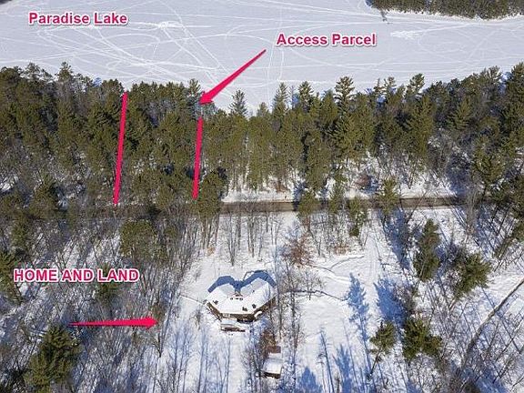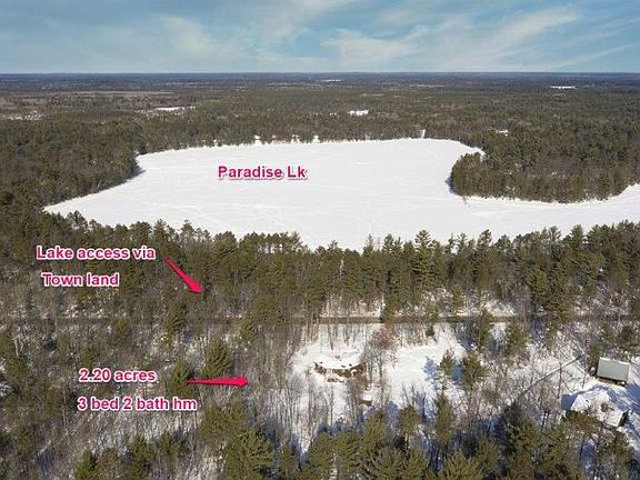 Investors or handyman type home buyers we have the perfect home for you! This place has great solid bones and sits on over 2 acres of land. It will need a complete interior update and remodel. There are a few great features to build off of such as T & G ceilings with beams, living area fireplace and a unique floor plan. There is a walking path to "gorgeous Caribbean blue colored " Paradise lake across the road that is owned by the town.. Sellers kids grew up playing in the water and enjoying the lake for many years and you can too via the public yet very private access across the road. Home has a 2 -car drive under garage, 3 bedroom and 2 baths with open dining/living area. The home also has a storage shed and plenty of room for extra garages, pole buildings or additions! Newer drain field, newer well. Priced almost $60,000 under FMV.