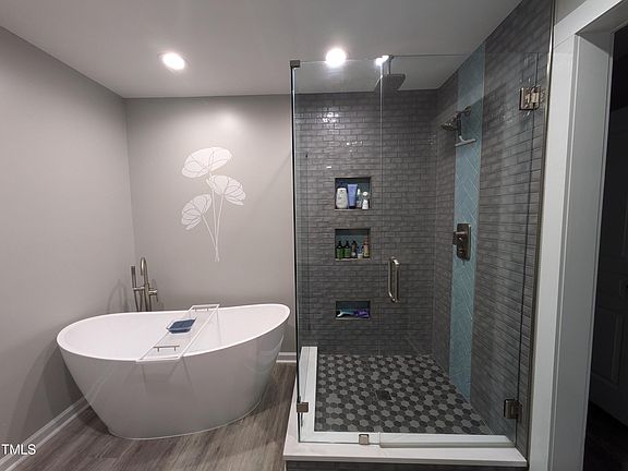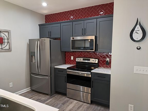 Recently renovated, bright and modern townhouse in Raleigh city limits. OFFERING $2000 IN CLOSING COSTS. Extensively remodeled and updated in 2020. Luxury vinyl plank (LVP) flooring and the same fresh paint color throughout creates an impeccable and consistent appearance. Kitchen is open to living space. New cabinets, QUARTZ countertops and gorgeous red glass tile accent the kitchen. Stainless- steel appliances added in 2020 all convey. Roof replaced by HOA in 2022. Two large primary bedrooms on the second floor each have a private bathroom and walk in closet. All light fixtures have been upgraded creating a bright aura within the home. Retractable blade CEILING FANS in the living room and both bedrooms. Laundry room located in the second-floor hallway closet. Full size Maytag washer and dryer do convey. Luxurious primary bathroom feels like a spa. CUSTOM TILE shower and soaking tub encourage time to relax and unwind. Private patio with plenty of sunshine for those who value outdoor chill time. Storage room located off patio. ALL APPLIANCES CONVEY. Close access to 440/I40/US1. Area shopping within less than1 mile (Tryon Village and Crossroads)