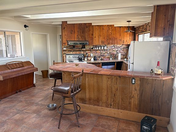 Charming two bedroom home in town, close to shops and restaurants in Old Town Yucca. Newly remodeled hall bath, vintage stone kitchen and lots of Joshua Trees on this fenced in property. Primary bedroom has en suite bathroom, garage provides ample storage and outdoor patio is partially shaded. Backyard backs up to wildnerness. Be close to everything but feel like you're away from it all. Looking for one year minimum. Utilities not included, except owner pays for trash.