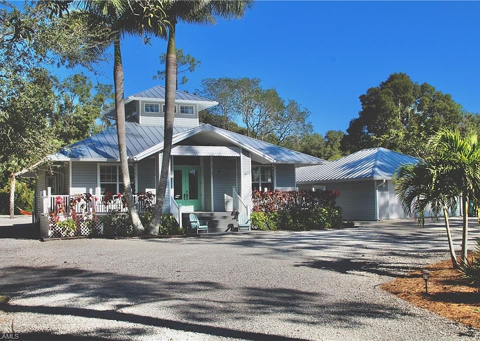 Priced to sell, this private Key West style Florida home on over an acre of land and just minutes to downtown Naples, beaches, shopping and restaurants. This gorgeous 3 bedroom plus den home has soaring ceilings in the living area, an updated kitchen, separate dining space, large primary suite with ensuite bath and two additional bedrooms and full bath to complete the interior. Backyard has a huge screened in lanai and separate deck off the back with hot tub and lots of space for toys, horses, pool or whatever your imagination desires. Large two car garage also has an additional separate air conditioned space - perfect for a work room or office. This space is not included in living area. Don't miss your opportunity to live the Naples lifestyle!!