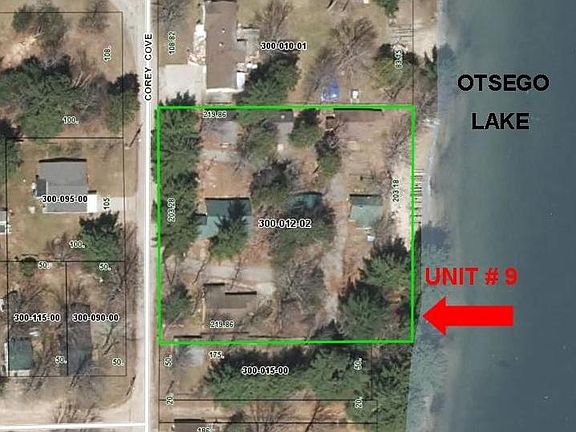 Fully furnished 2 bedroom 1 bathroom log cabin located just steps from the sandy Otsego Lake shoreline with 203 feet of shared lake frontage. Includes a 1/9th interest in Corey Cove Shores Resort. This extremely well cared for cabin with newer metal roof is unit #9 and located right on the beach! Completely turn-key vacation getaway on the lake could be used as a vacation rental to offset ownership costs. Located close to County Park, State Land and groomed snowmobile trails. NEW SEPTIC SYSTEM 2020