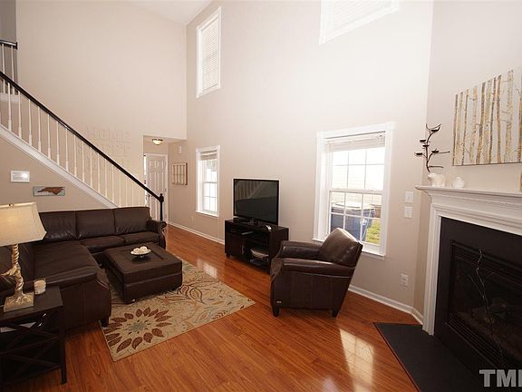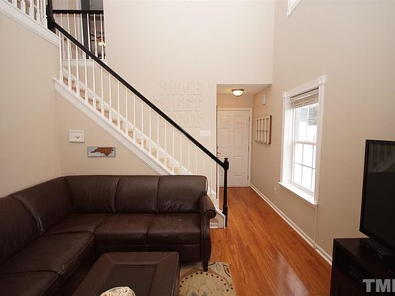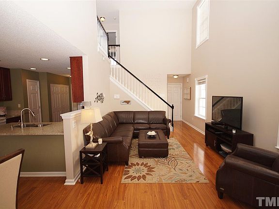 Super Cute w/Great Updates & Floor Plan! Lots of Fresh Paint & Updated Fixtures! Modern Hardwood style flooring in 2 Story Living Rm w Multiple Windows Filling the Space w Light! Kitchen w. Granite Counters, generous cabinetry & full appliance pkg flows into Dining Area. Slider leads to Fenced Yard w. amazing custom Patio. Stacked stone bench seating & fire pit is perfect for entertaining! Master w. Private Bath & WIC! HOA maintains front lawn. Desirable LOCATION convenient to I-540, RTP & Brier Creek!