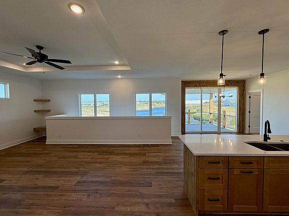 Back by popular demand, the Baby Bella Plan by RJ Castle Custom Homes, nestled in a peaceful cul-de-sac on a picturesque lake lot. This stunning residence boasts four spacious bedrooms and three beautifully appointed bathrooms, making it the perfect family haven. The heart of the home features a cozy living room with a striking marble tile fireplace, ideal for gatherings or quiet evenings. The rear-facing kitchen, complete with a walk-in pantry, seamlessly blends functionality and style, catering to both culinary enthusiasts and everyday living. Step outside onto the covered deck, where you can relax and take in the serene views, with convenient steps leading down to a charming ground-level patio. The luxurious master suite is a true retreat, featuring a full tile shower for an indulgent experience. Plus, the fully finished lower level with walk-up wet bar offers endless possibilities for entertainment and relaxation. Experience lakeside living at its finest in this remarkable new home here in beautiful Watermarke! Some information may be estimated, and is not guaranteed, please verify schools with USD262.
