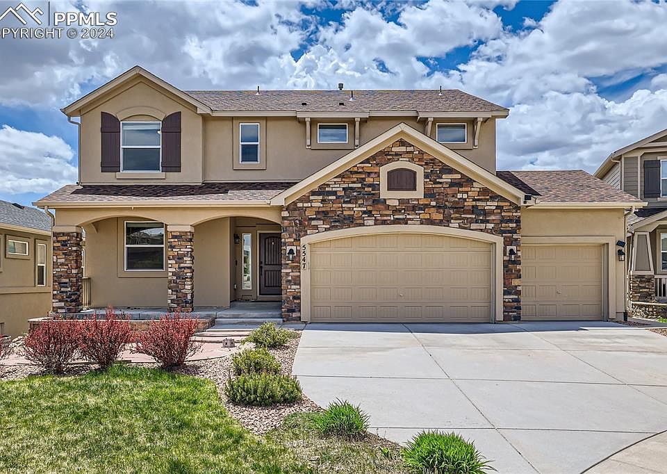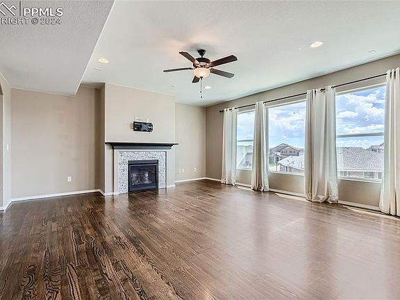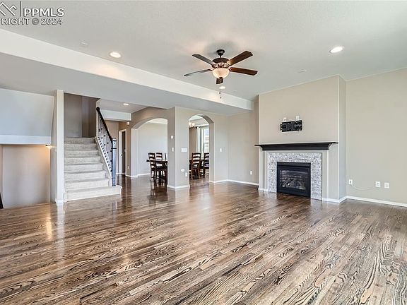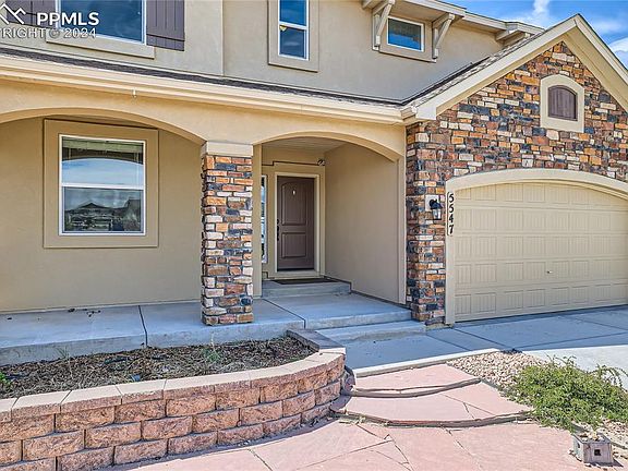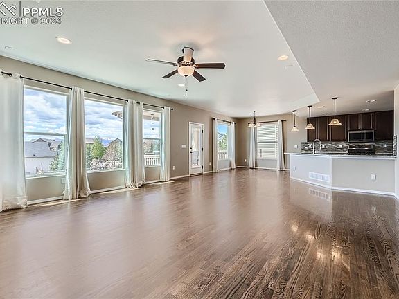 Stunning 6-bedroom home plus office in desirable Wolf Ranch and award-winning D-20 schools offering panoramic Pikes Peak and Cheyenne Mtn views! A beautifully designed open floor plan, multiple living/dining areas, tremendous great room with walls of windows, rich hardwood floors, gas fireplace, gourmet kitchen with granite and stainless-steel appliances, luxurious master retreat, expansive walk-out lower level, wet bar, and premier outdoor living areas including three patios/porches, covered composite deck, and a fenced and landscaped yard all showcase this exquisite home. A covered front porch welcomes you inside to polished hardwoods and the expansive great room with huge picture windows and a warm fireplace, perfect for cool Colorado evenings. The chef’s kitchen boasts slab granite, stainless steel appliances, gas stove, pantry, and a spacious counter bar. Nearby formal and informal dining areas offer ample space for entertaining, and glass doors open to a large covered deck with gas line for outdoor living. The luxurious upper-level master retreat has arched doorways, tray ceilings, walk-in closet, and generous windows framing panoramic peak views. The 5-piece master bath is a private sanctuary with a soaking tub, double sinks, and a walk-in shower. Three additional upper-level bedrooms share a hall bath with double sinks, and a loft area provides flex space. The upper-level laundry has cabinetry, folding table, and included washer/dryer. The beautifully finished walk-out lower level boasts 9’ ceilings, a large family area with a full wet bar, and doors opening to the rear patio and yard. Two lower level bedrooms and bath offer privacy for family and guests. Other home features include a main level executive office, new whole-house humidifier, 3-car garage with 30-amp wiring, mudroom, newer roof, and an excellent cul-de-sac location near parks, trails, and D-20 schools. With spectacular indoor and outdoor living space, this stunning home is not to be missed!
