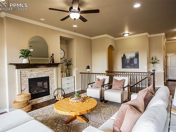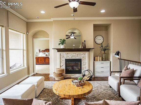 A Wolf Ranch beauty! Amazing combo of elegance and comfortable living. Right as you walk in you'll be welcomed by the natural light, tasteful finishes, and open floor plan. The living room boasts large windows for viewing the mountains and a gas fireplace. The spacious kitchen includes a gas range, 2 ovens, island, under cabinet lighting, and an eat-in area that has an entrance out to the back deck. Through the convenient butler's pantry the formal dining room is simply stunning, highlighted by the archway detail. The primary bedroom features a large window, attached 5-piece bath, and a walk-in closet. Also on the main level is another bedroom/office, full bathroom, laundry room, and built-in drop-zone storage off of the garage door. Downstairs, the finished, walk-out basement provides a ton of additional living space with a huge family room and wet bar with lots of counter space. There are 3 more nice-sized bedrooms and 2 bathrooms. Outside, the backyard offers low maintenance landscaping, a built-in fire pit and seating, covered deck with mountain views, and covered patio space beneath. With an in-home air purifier, convenient location, great parks nearby, and amazing outdoor living spaces this home is a gem.