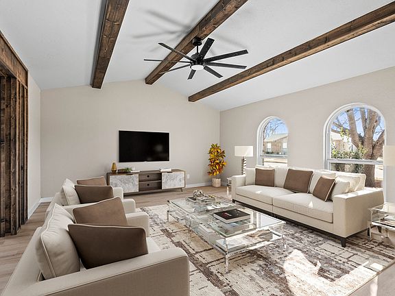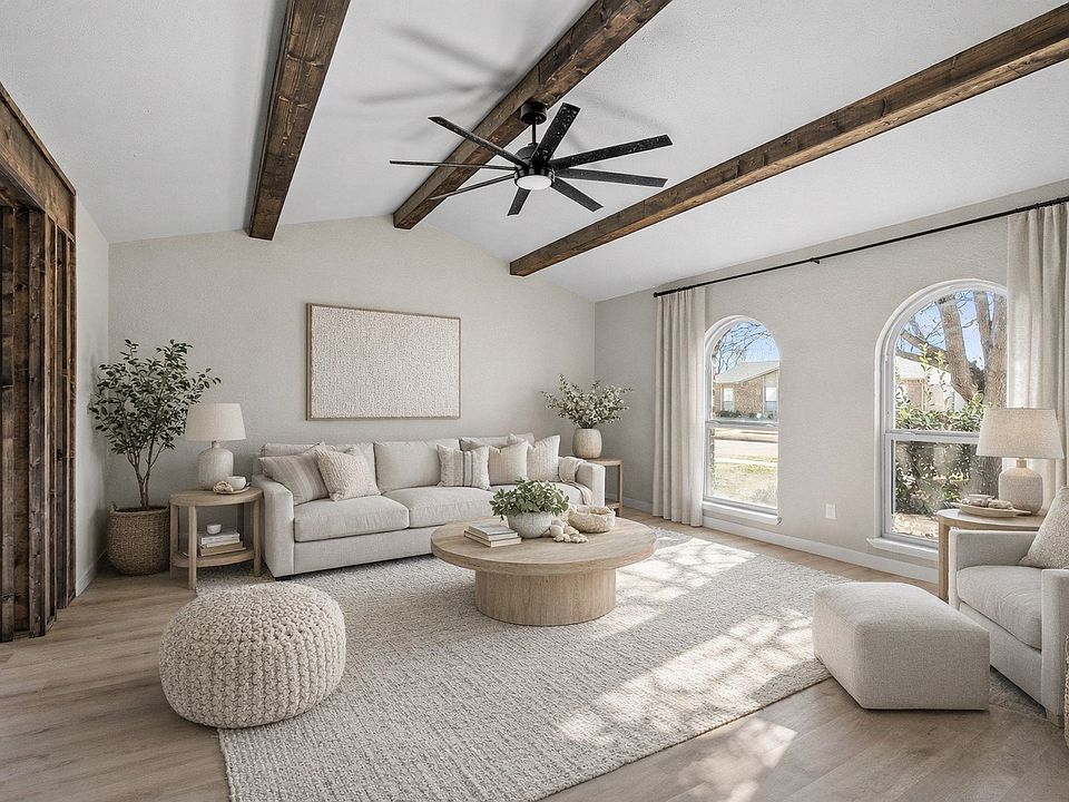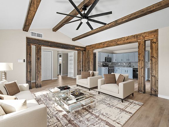 From the curb, you're welcomed by a warm brick and cedar facade, mature tree, and freshly landscaped yard. Inside, you’ll find an open layout with light wood flooring, custom rustic beams, and built-in shelving that adds charm and functionality. The kitchen boasts newly painted cabinetry in a soft modern hue, granite countertops, a sleek tile backsplash, and stainless steel appliances—all flowing into a bright dining area with French doors leading to the backyard.