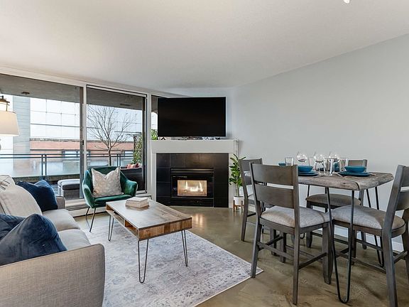 Beautifully updated, NE CORNER offers 2 king sized bedrooms plus large den with an expansive 300 sqft private deck showcasing views of the NorthShore Mountains. Chef inspired kitchen with S/S appliances, quartz countertops & sleek cabinetry. Polished concrete floors throughout, custom window shutters in bedrooms and all your heating is included in your strata fees (hotwater baseboards & gas fireplace). Step outside to the beautifully landscaped 3rd-floor garden/ courtyard right at your doorstep. Notably, enjoy the added bonus of short term rentals (airbnb) allowance and pet friendly policies adding to the allure of this incredible opportunity. Building amenities; indoor pool, fitness centre, hot tub, sauna & games room. New Roof 2022, healthy Contingency & pro-active strata council.