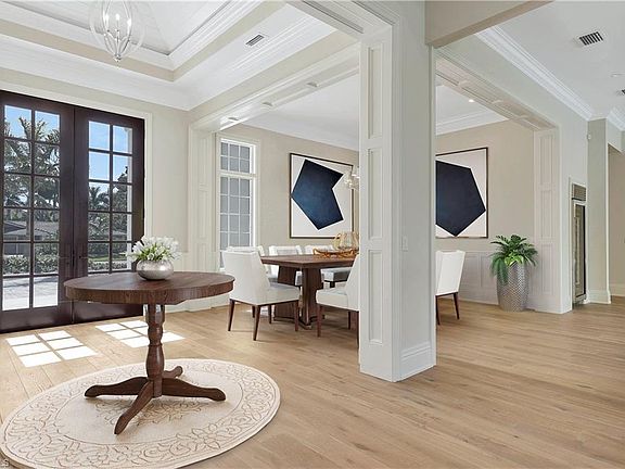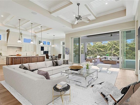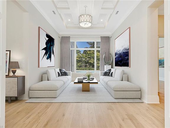 H. 14072 Introducing a stunning new home in the heart of the Moorings on elegant Anchor Rode Drive. Built by Dillman Construction, one of Naples premier luxury builders & designed by RG Designs, this inviting coastal home takes maximum advantage of natural light from every exposure. Created to reflect today's indoor/outdoor lifestyle, the home offers the perfect balance of a great room floor plan, PLUS the privacy of a separate living area & den. Incredibly bright and open back garden with 44-foot lap pool & spa, water fountains, bubbling pool and sunshelf. Expansive outdoor living area with kitchen, linear gas fireplace, pool bath, outdoor shower & electric screens & shutters. Luxury finishes throughout the inside as well, including wide plank Legno Bastone European oak floors, Sorhegui tiles, custom wood trim and wainscoting, and exquisite wall finishes. Other great features include Sub Zero & Wolf appliances, hidden walk in pantry, wet bar and Sub Zero wine cooler. Rounding out the floor plan are 4 bedrooms, each with en-suite bath, and garage space for 4 cars. Perfectly located just minutes to both the private Moorings Beach Park & the shops & restaurants of Venetian Village.