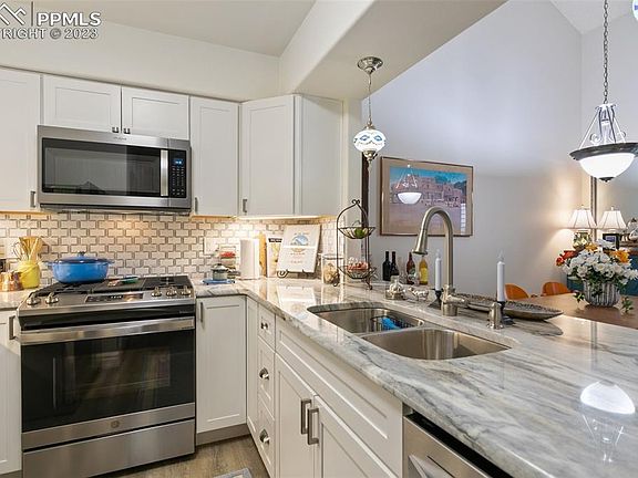 This beautifully updated townhome is tucked in the Pinecliff neighborhood in NW Colorado Springs, with easy access to hiking, parks, shopping and I25, while feeling a world away. You'll be amazed at how this space feels so welcoming! Wonderfully appointed inside, you'll notice the GORGEOUS new kitchen with high end finishes, gas range and stainless appliances. Use the breakfast bar or dine in the adjacent breakfast nook, or even better - step out onto your private covered back patio and watch the wildlife pass by or tend to your plants. There's a main level primary bedroom, plus a loft AND 2nd bedroom on the upper level, perfect for an office, craft area or guest space. The living room has a pretty stacked stone 2-sided gas fireplace, lending an even cozier feeling to this charming home. This end unit townhome comes with an assigned covered parking spot right in front! Some homes captivate you the moment you step inside. This one surely will get your attention!