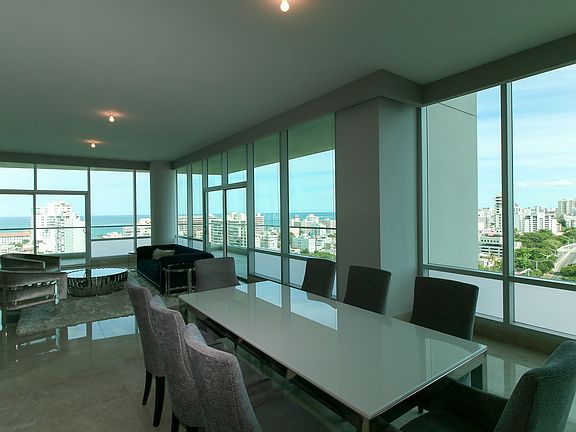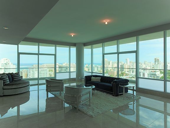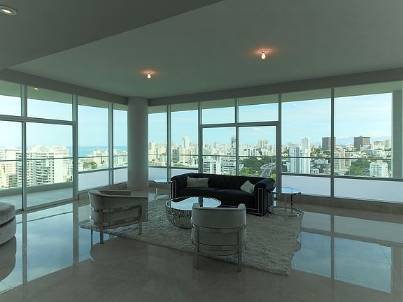 ***SOLD*** Experience northeastern panoramic views of the ocean, lagoon and mesmerizing skyline from Condado Beach to El Yunque Rainforest, in this 5,368-square-foot, junior penthouse at the Cosmopolitan - a luxury lifestyle residence. Situated on the 15th floor with direct access elevator into private entry foyer, sleek wood and stone surfaces used throughout the space contribute to the streamlined aesthetic of the newly renovated designer kitchen with island and extra bar for seating, impeccable architectural finishes, custom mill-work and built-ins. Light-filled rooms flow seamlessly together for the ultimate in modern urban living with 5 bedrooms, 5 bathrooms, and 2 powder rooms, floor-to-ceiling windows, a home office/library, an expansive corner wraparound terrace that frames the main living area and dining room. The master suite, sure to impress has a deep private terrace, alluring views, 2 over-sized walk-in closets and electric shades. Equipped with a smart home system and located within the hip Miramar Arts District, steps to the jogging/biking path at Condado Lagoon and surrounded by restaurants and culture, the Cosmopolitan offers concierge & doorman services, fitness center, infinity pool, outdoor grill with sundeck, clubhouse with bar, pantry and billiard. Two full-capacity power generators and water cisterns. 3 garaged parking spaces. Monthly Maintenance: $2,044