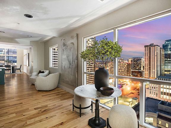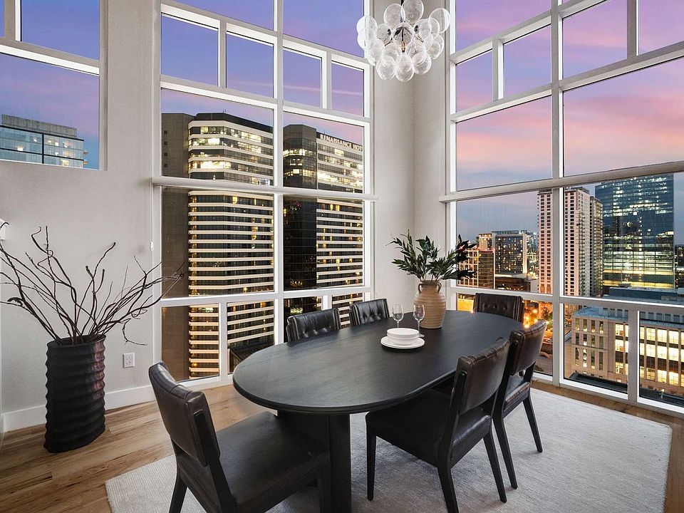 Perched on the 23rd floor of The Cumberland, this one-of-a-kind, two-story corner penthouse offers unparalleled city views and luxurious living. Spanning nearly 3,000 square feet, this fully renovated masterpiece combines two units to create a home that blends the spaciousness of a single-family residence with the sophistication of downtown living. The thoughtful renovations include new HVAC systems, ductwork, and water heaters, along with a completely transformed kitchen featuring a Bosch induction cooktop, custom copper range hood and sink, a 9.5-foot quartz island, and a walk-in pantry. The main floor boasts a stunning primary suite with a cozy sitting area, morning bar potential, and a spa-inspired marble bathroom with a soaking tub, walk-in shower, dual vanities, a water closet, and a generously sized walk-in closet. The suite opens to one of three private balconies, perfect for taking in the city skyline. The dramatic dining room, lined with two-story windows, flows seamlessly into a nearby study. Upstairs, two additional bedrooms, two bathrooms, and a versatile bonus room overlooking the dining area complete this elegant residence. With three dedicated parking spaces, this penthouse is a rare opportunity to experience downtown living at its finest.