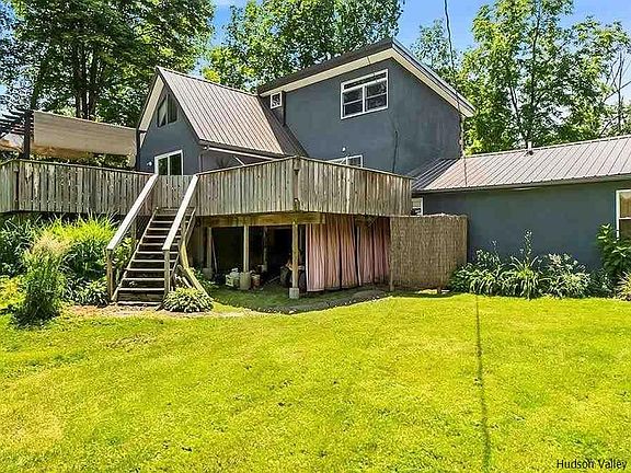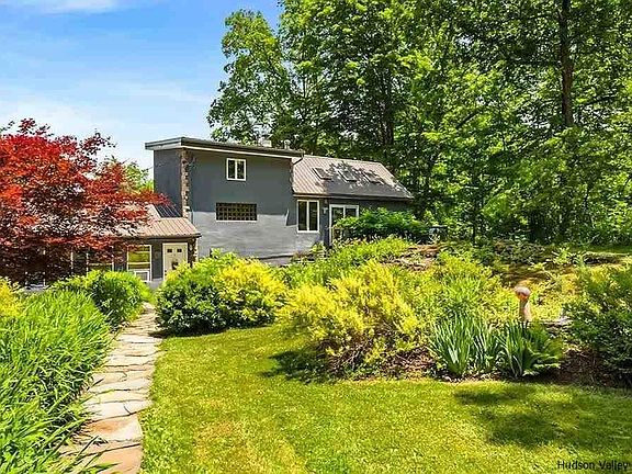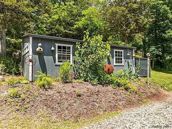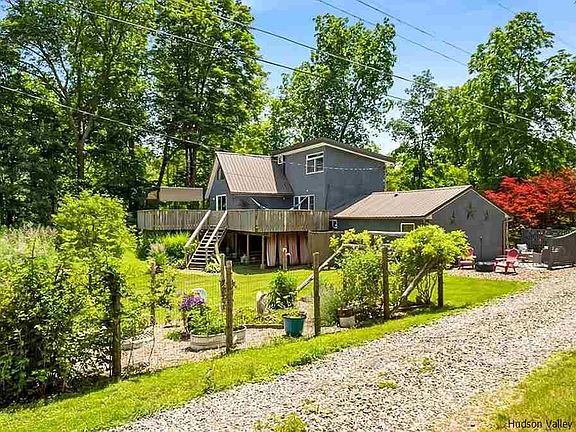 Live the ultimate Hudson Valley experience with this well kept Contemporary house located on a private country road, yet within 15 minutes to all services. This one acre lot is picturesque with several established perennial gardens throughout the property, there is always something in bloom and popping with color. This property is totally peaceful and private, the location of the home finds itself set back from the road just enough. This is not a cookie cutter home, it's an artistic space that you don't want to miss. After many upgrades and renovations this eclectic home is just the perfect place to enjoy, relax and immerse yourself in all things Hudson Valley. You will find brilliant attention to detail, quality, and scale in this Stucco sided home. One visit and you'll see the uniqueness of this well constructed and well insulated, maintained country home. There is a new propane boiler for heat and hot water, as well as mini split to keep you cool in summer. It's easy to imagine yourself living in this open floor plan home that has beautiful granite kitchen counter tops and beams of light shining through the 4 oversized sky lights in the kitchen area. The main home has 12 foot ceilings, the open kitchen with gas range, stainless steel fridge and dishwasher allow for the warmth from the Jotul wood stove to radiate the entire space. The Ambrosia, live edge staircase with unique 'tree' wall paper from England leads you to the second floor master bedroom loft that has seasonal views of DeWitt Lake. There is a second loft area as well for extra guests. The one acre of mostly level and gently sloping land is well maintained. The natural rock and stone walkways complete this country home. There is a gorgeous custom built Bark on Cedar garden with raised Stainless Steel beds. The owner has planted a complete garden just for you! Come summer you will be surrounded in berries, homegrown tomatoes, Japanese eggplant, fresh flowers for cutting, and a variety of herbs in the country garden. If you are dreaming of homesteading, this property is a chance to make that dream a reality, complete with a chicken coop and a one car Amish Built Garage with heat, electric and a loft. There is ample room for animals, farm or domestic. There is a half acre of land that has already been fenced for your furry family members. The fence is 4' ft tall (Agricultural Wire and Welded Wire) double fenced for extra security, it is in perfect condition with two walk through gates, one leading off the back trex deck and another to separate the zones and one- large farm gate in the back nearest the garage that allows for lawn mowers or a vehicle to pass through. The house will come with a 4-6 person Hot Tub for relaxing in on the back private deck. There is a rustic bohemian outside shower area, with both hot and cold water complete with 'John Burroughs' ferns. There is a steel pergola on the back trex deck that will stay for your enjoyment. The land is beautiful, private and wooded. There is a large Amish built shed for storage as well. There is an established BNB (Blandina's Hideaway Villa) located on the property if you should choose to also live the dream of an Inn Keeper. It's attached to the main home, however, it is completely separate and private. Your future guests will have their own private bathroom and entrance, kitchenette, complete with their own outside patio and fire pit area.