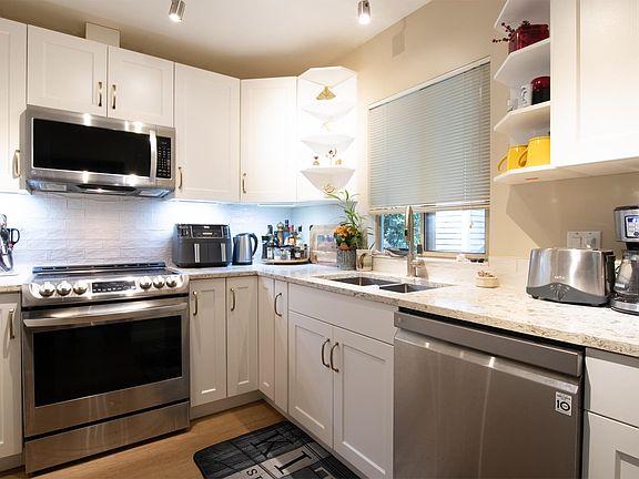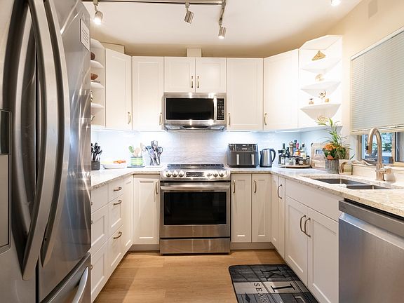 Vaulted ceilingsNewer plank flooringUpdated kitchenGranite countersUpgraded appliancesModern lightingLarge laundry room