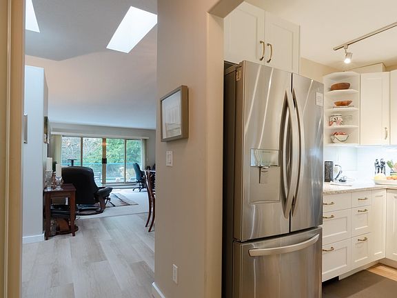 Spacious, renovated 1-bedroom home in the popular Georgia Mirage community! One of only two homes overlooking the peaceful ponds and gardens, this south-facing suite offers privacy and a beautiful outlook. With over 900 sq ft, vaulted ceilings, skylights, and newer plank flooring, it feels bright and relaxed. The updated kitchen features granite counters, upgraded appliances, and modern lighting. Enjoy the sunny balcony with 180° views of the greenspace. The bedroom includes a walk-thru closet with custom organizers, plus direct access to the bathroom. A large laundry room, covered parking at your door, and a short stroll to the Club House complete this lovely home—all in the heart of Gibsons.