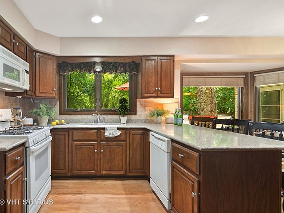 Fall in love! This traditional, center-entry, 4 bedroom, 2.1 bathroom brick colonial home has been meticulously updated and is ready for you to move right in! Set amongst the mature Elm trees and breathtaking backdrop of the highly desirable Jewel Park subdivision, this charming home is nestled on nearly half an acre. Travel up the brick paver path before stepping inside the welcoming foyer, with slate floors, flanked by lovely formal living and dining rooms. The eat-in kitchen has everything you need for casual meals at home or friendly gatherings, with hardwood cabinetry & granite countertops, plus direct access to the mudroom with Whirlpool washer & dryer, extra storage and door to the attached, 2-car garage. Open to the kitchen is the cozy family room, with brick, wood-burning fireplace surrounded by hardwood built-ins & cabinetry and steps away from the three-seasons room with TV & cable hookup - perfect for watching Monday night football all season long! Upstairs, relax & unwind in the primary suite that features an oversized floor plan with large walk-in closet and updated, ensuite bath with double vanity, soaker tub and double walk-in shower with rain showerhead, hand-held sprayer, bench & frameless glass surround. The three other second floor bedrooms are generously sized and feature large windows and ample closet space and share a hallway bath with shower/tub combo. Host movie or family game nights in the lower-level recreation room, with exercise area, plus storage and another, separate finished room with walk-in closet - perfect for a home office. Expansive backyard features mature specimen trees, sprawling, manicured lawn and a large back deck perfect for fall gatherings. NEW Asphalt Roof in 2023! Conveniently located near A+ Barrington schools, parks, shopping, dining, libraries, public pools, Metra station & more!
